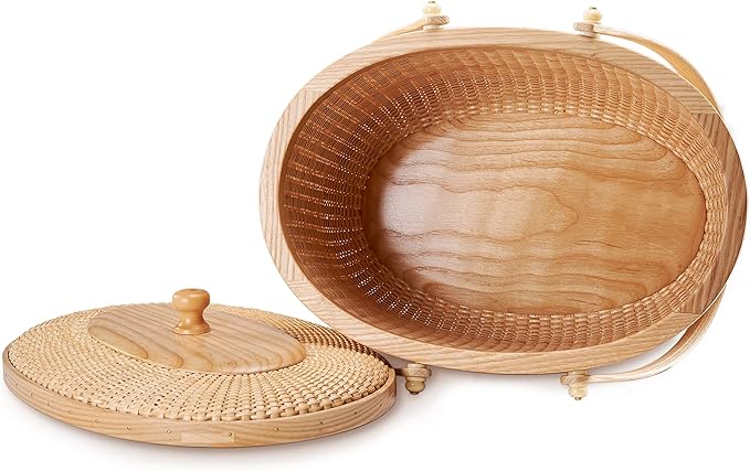 - Shape: oval, a cover, two handle, make full use of the space, beautiful appearance and practical.Cane staves finely-woven with cane weavers,Hard ash wood base plate
