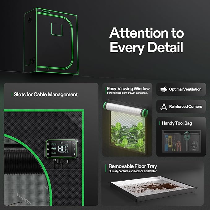 - Easy Observation & Maintenance: With a visible window made by transparent plastic set on the grow tent, you can check the growth status of your plants at any time; The window at the bottom is helpful for heat dissipation; The hook and loop fasteners on the cover of the window are easier for you to open and observe inside; It is also equipped with a removable floor tray that is convenient to be cleaned and conserved