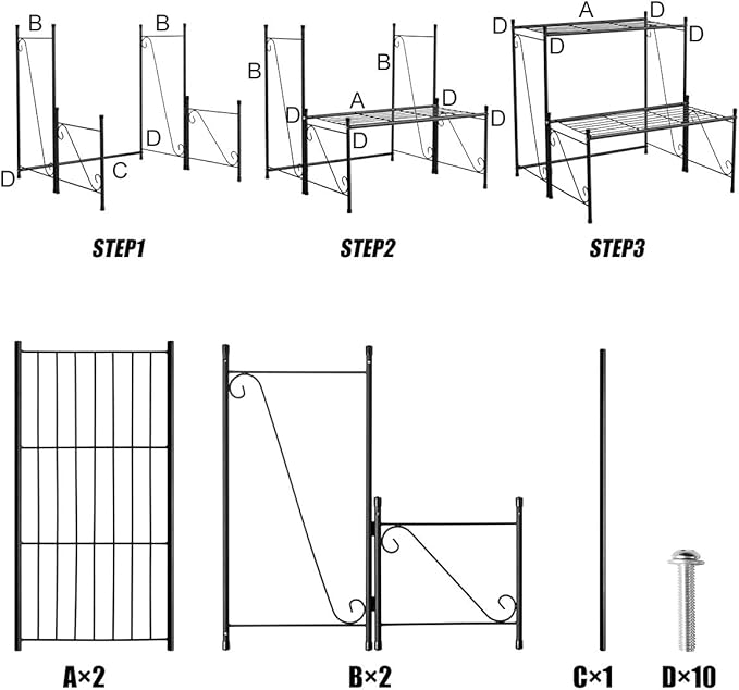- Space saving indoor outdoor design with black metal frame and 2 iron style shelves, organize your garden and life. Simply assemble without any tools. For installation instructions, please refer to the picture on the left