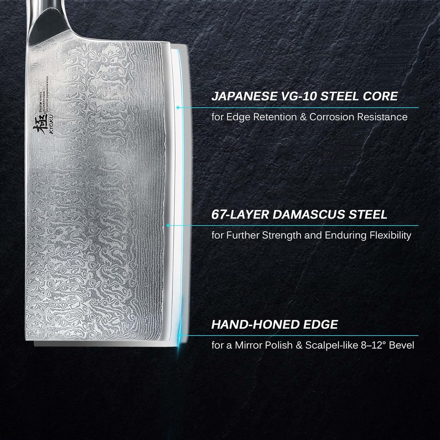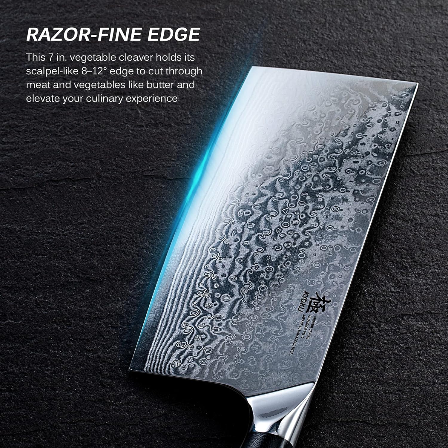 - VG10 JAPANESE DAMASCUS STEEL - Manufactured with an ultra-sharp, cobalt-added, and cryogenically treated VG-10 Japanese Damascus steel cutting core at HRC 58-60 hardness, this 7 in. vegetable cleaver boasts unrivaled performance and incredible edge retention