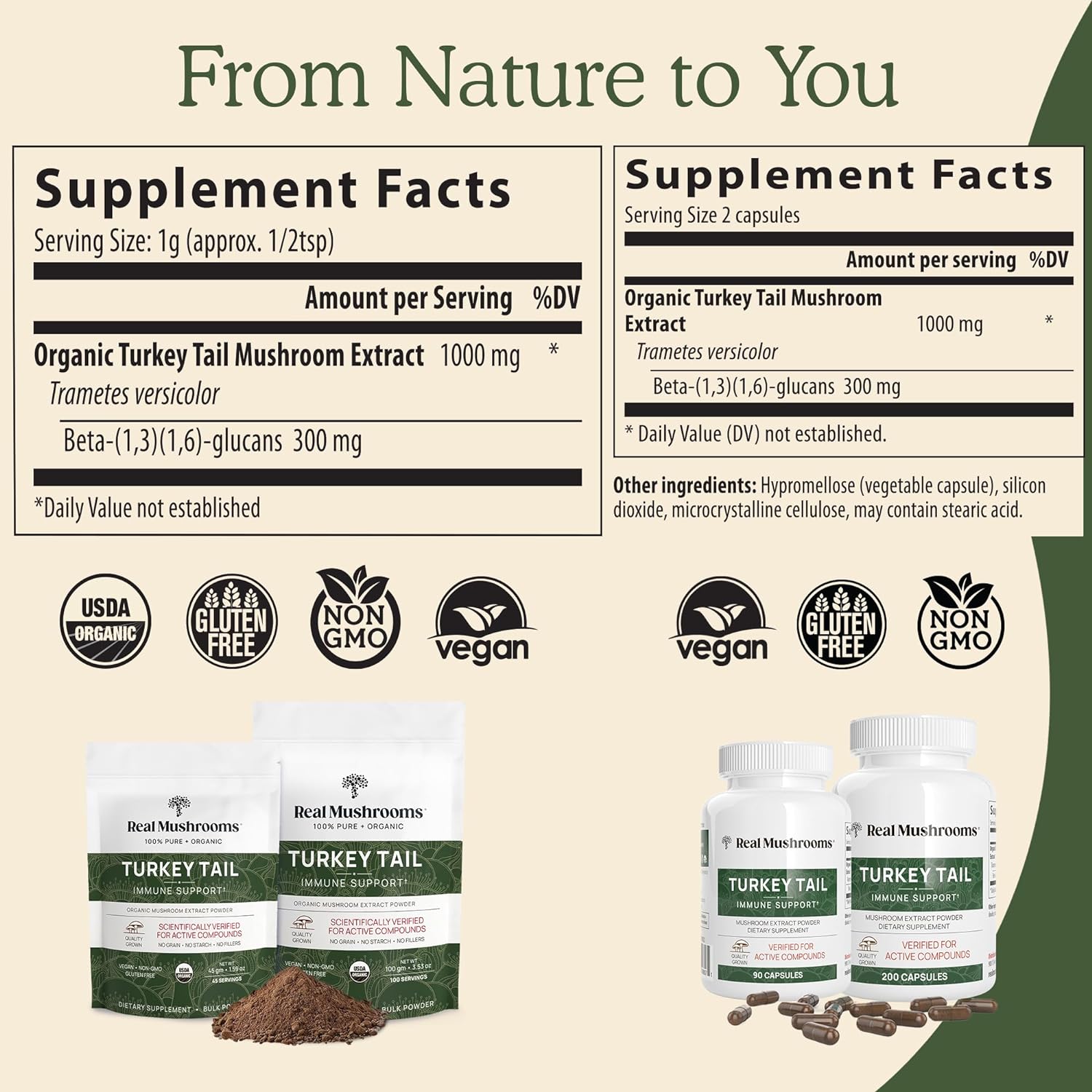 - USDA Organic Mushrooms Made Real: This turkey tail mushroom supplement is USDA Organic, vegan, non-GMO, and gluten-free—crafted by Real Mushrooms with 40+ years of expertise.