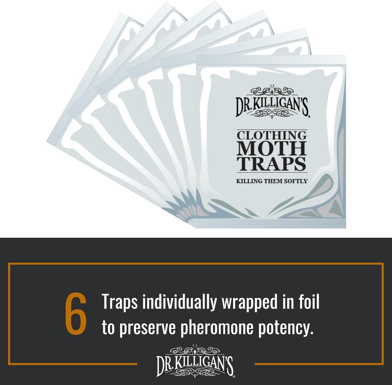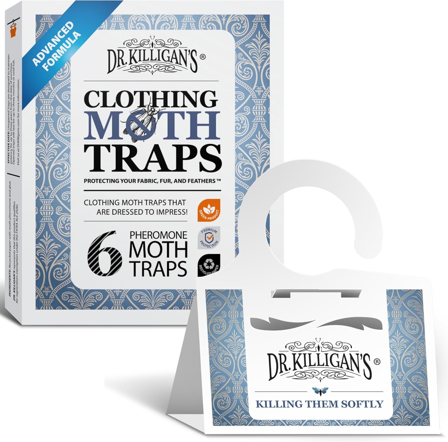 - Design Options — Dr. Killigan's moth traps boast an attractive appearance while being a safe (when used as directed) alternative to moth balls for closet. When buying a 6-pack of Premium Clothing Moth Traps, you have the choice between two distinct design options. Regardless of your selection, each trap features the same exclusive, highly effective pheromones and top-quality adhesive.