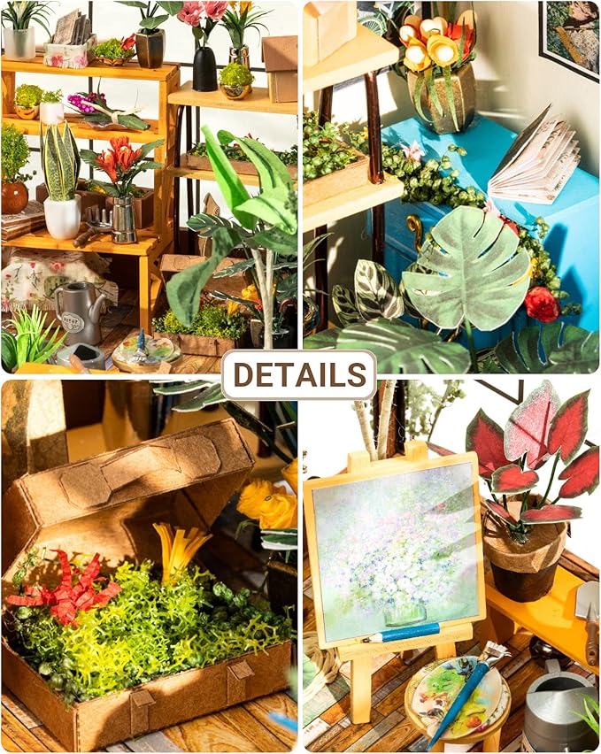 - 【DIY MODEL KITS,PREMIUM QUALITY MATERIAL】The pacakage contain the Wood,Fabric,Paper-cut,Glue,Pigment,Tweezers.The diy mini dollhouse is very well made.The tiny accessories showed in the picture can be painted,cutted or sticked to built with your hands.The furniture and other wooden pieces are precisely cut so that they fit together correctly.LED light,plants,ornament,furniture are quite realistic and cleverly designed,There are well worth the price if you are looking for pleasure.