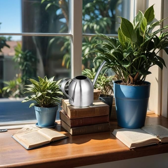 - Long Spout: This cute little watering can has a long slender spout that easily sneaks In between stems. Gets into the small spaces in your houseplants in order to water them thoroughly.