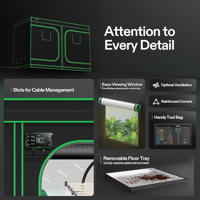 - Easy Observation & Maintenance: With a visible window made by transparent plastic set on the grow tent, you can check the growth status of your plants at any time; The window at the bottom is helpful for heat dissipation; The hook and loop fasteners on the cover of the window are easier for you to open and observe inside; It is also equipped with a removable floor tray that is convenient to be cleaned and conserved