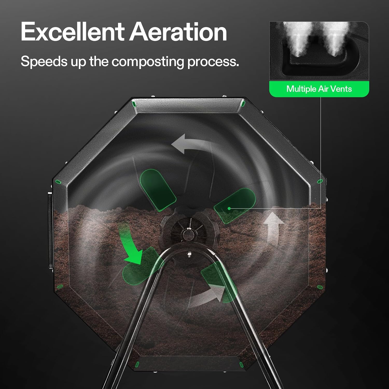 - 360⁰ Tumbling Design: The rotating design prevents you from digging or mixing the pile by hand; And the deep fins on eight panels make it easier to turn the compost bin