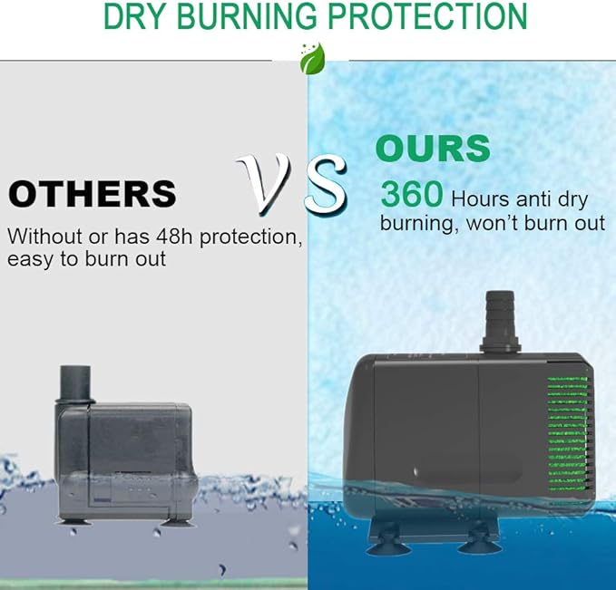 - 【DRY BURNNING PROTECTION】Considering that the users will forget to add water, we have added a temperature control protection switch inside the pump. When the pump is running-dry, it will automatically cut off the power when the temperature of pump is high,360-hour dry burnning protection,Don't worry that there is no water in your fountain, which will cause the pump to burn out.