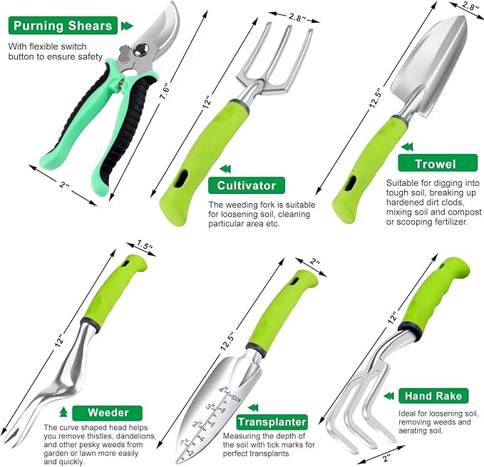 - ►High-quality and Sturdy Gardening Kit:The garden tool organizer with 6 large size metal hand tools are made of heavy-duty aluminum with Ultra-fine Polishing Technology to keep corrosion resistance and toughness. The gardening items are high hardness and no need to worry about rusting and breaking. The garden gifts handle is made of high-quality Tpr rubber with anti-slip performance and comfort to reduce hand and wrists fatigue, gardening gifts providing you with pleasure using experience.