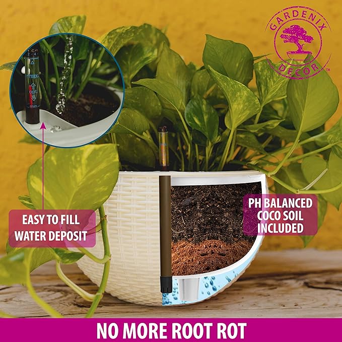 - Unlike other hanging pots for plants that allow water collect – leading to root rot – Gardenix self watering hanging pots are designed to keep your soil well-aerated with a unique 2-part watering system: 1) easy-to-use hydroponic device to provide an ongoing supply of moisture and 2) pre-mixed pure coco soil to circulate air around your plant’s roots. Our hanging planter works to single-handedly provide your plants with adequate moisture over a 2-week period – Great gifts for woman and men.