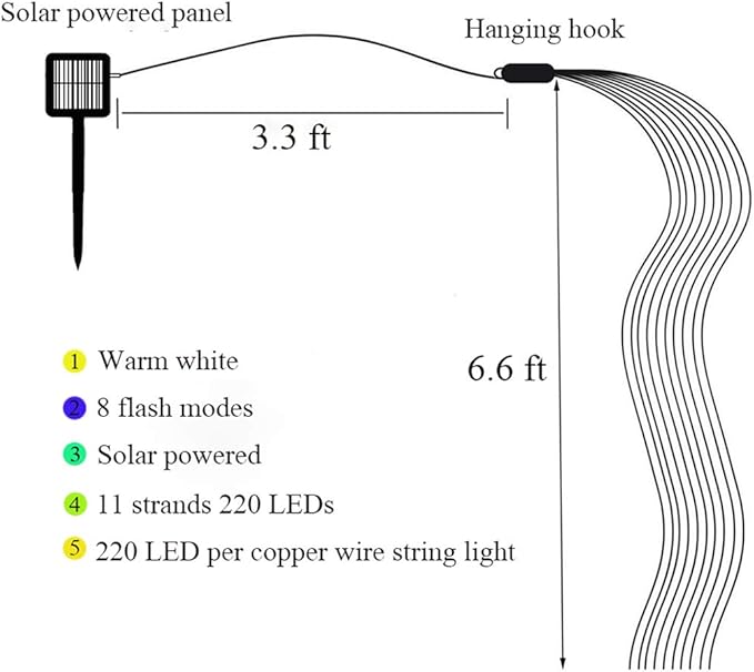 - Solar Waterfall Decor: Solar powered firefly bunch lights, 8 modes of adjustment (combination, wave, continuous, flash, flash, slow fade, flash and constant light), is an ideal decoration light for creating atmosphere.