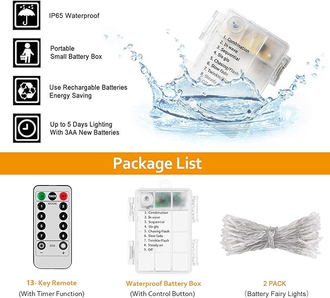 2 Pack 36ft 100 LED Battery Operated String Lights with Remote Timer Waterproof 8 Modes String Lights for Bedroom, Garden, Easter, Party, Christmas Indoor and Outdoor Decorations -Warm White