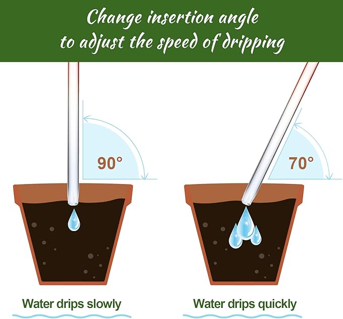- 🌷【Mini Irrigation System】The draining speed of water depends on various factors, including the type of soil in the pot, the amount of water the plant needs, the ambient temperature, etc. Change the insert angle to adjust the rate of emptying and water the plant thoroughly before using the waterer to prevent it from emptying more quickly than expected. Overall Length: 10.2”, Water Reservoir Storage Capacity: 95mL.