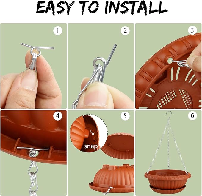 - Easy to install: Two kinds of chains are shipped randomly. Passing the metal chain through the holes on the edge of the planters to install the chain. Snapping the protrusion of the tray into the groove at the bottom of the pots to install the tray. Refer to detailed pictures and videos.