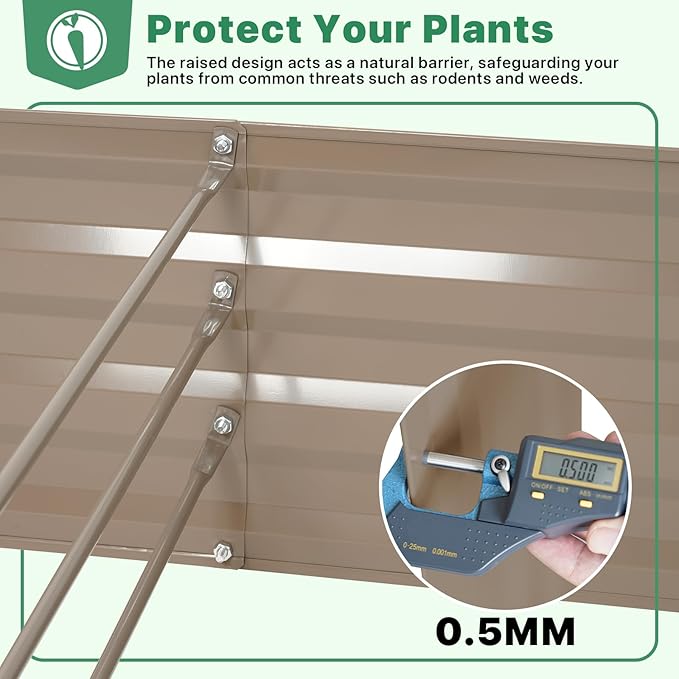 - Built to Last: Authentic 0.5mm thick galvanized steel sheets. Unlike some others, we don't present false measurements to you. Our high-quality galvanized raised garden bed are not only durable but also resistant to rust and corrosion. The sturdy and long-lasting metal garden bed ensures your garden bed stands the test of time.