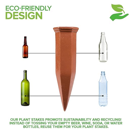 - Eco-Friendly: Instead of tossing your empty water bottles, reuse them for your plant stakes. They can hold any long neck bottle to provide at least 1 liter of water to your plants for upto 7-10 days. As the water begins to run out, just refill.