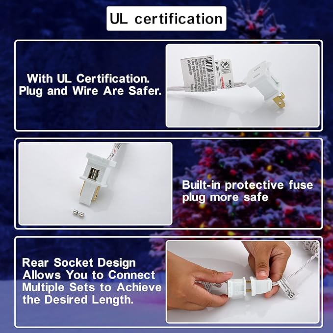 - 🎄【Safe & Durable】Passed UL certification test. IP 44 waterproof feature ensures the Christmas pathway lights can illuminate under a rainy, snowy day. Provide 4 spare fuses and bulbs for replacement in case.