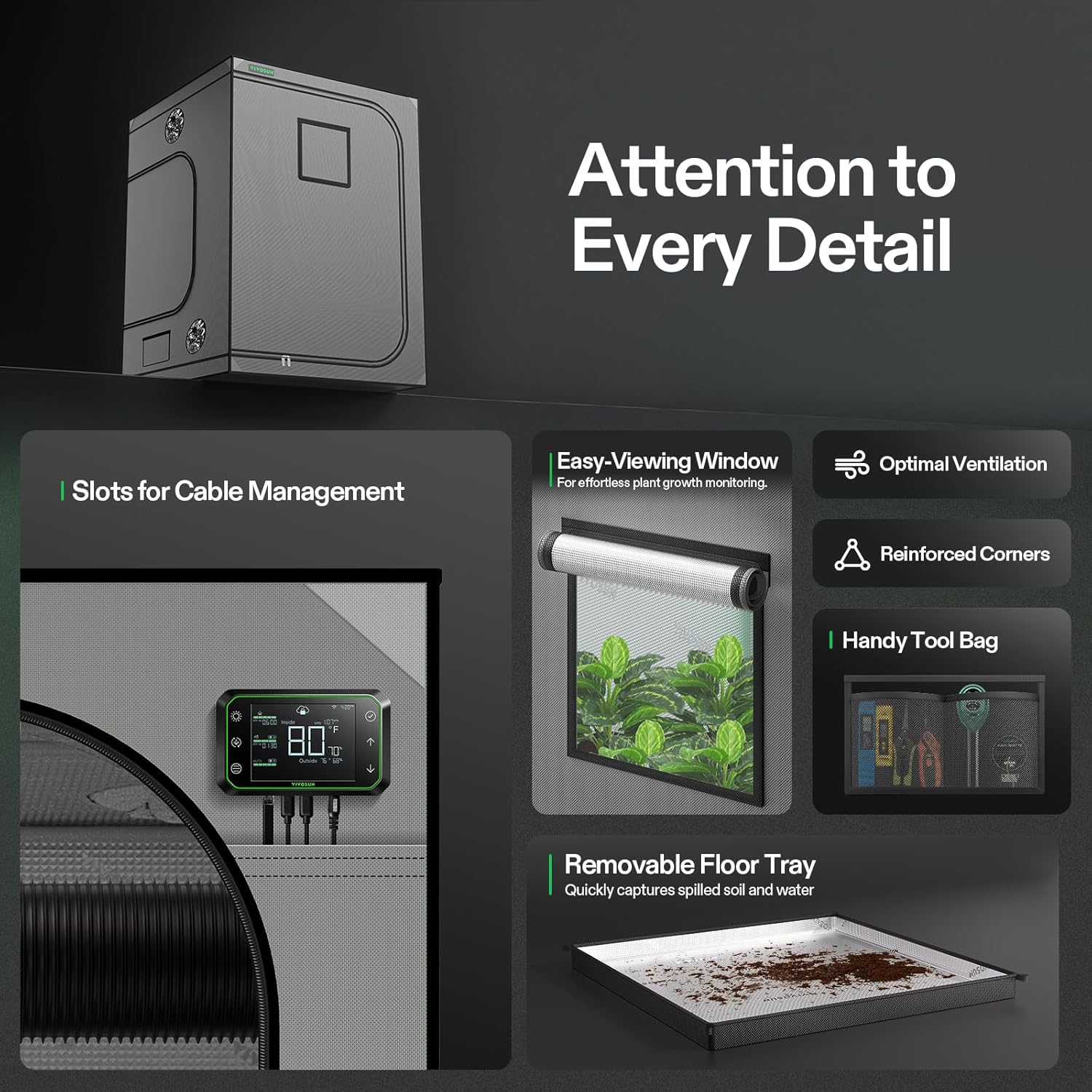 - Observation Window + Removable Floor Tray: Our easy-access observation window makes it easy to observe your plants; The detachable floor tray captures any spilled soil and keeps the tent clean