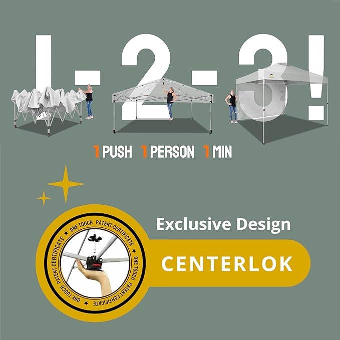 - ONE BUTTON EASY SET UP - Our 10x10 pop up canopy tent features patented one push center lock tech. With just a single push, the central hub locks the poles in place. Designed for the next generation, this outdoor canopy for patio can be set up by two people in seconds without any tools. Three adjustable height settings with soft, pinch-free buttons ensure convenience and safety, making it perfect for camping, beach outings, craft fairs, tailgating, farmer markets, outdoor BBQs, and more