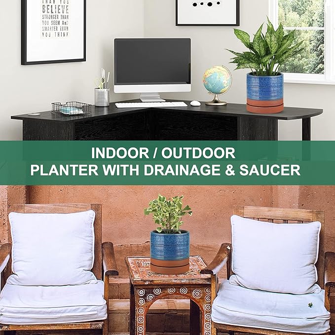 6 Inch Plant Pots, Ceramic Planter Pot with Drainage Hole & Saucer, Indoor/Outdoor Cylinder Round Planter Pot, Aqua Blue & Terracotta Red