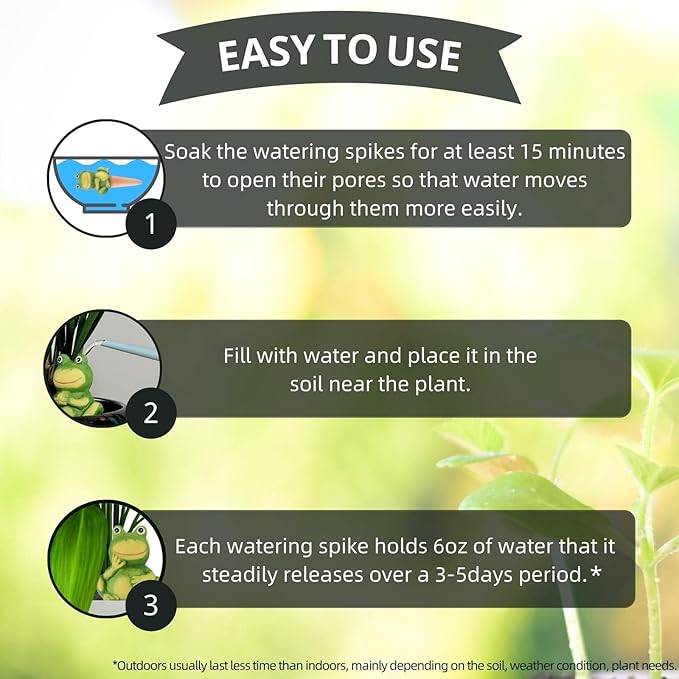 - NO COMPLEX STEP –100% Terracotta watering spikes different from watering globes or wine bottle watering spikes, easy to refill without removing. Simply pour water from your plant watering can into the head of the frog self-watering bulbs, and your plant will take care of itself. A perfect houseplant accessory.