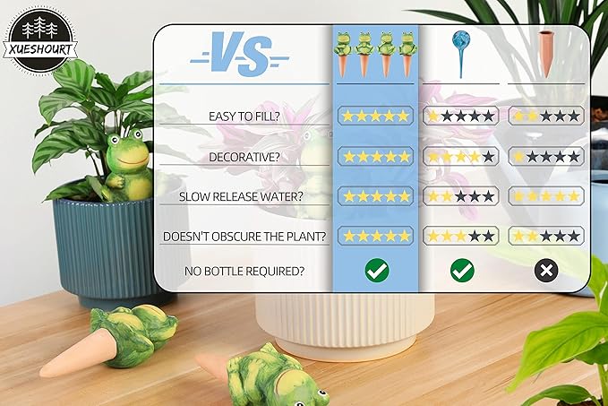 - ENJOY YOUR TIME – There is no doubt automatic plant waterer are an easy and efficient way to take care of plants while you are on vacation or otherwise busy with the rest of your life. Try them out from XueshouRT and let these ‘green thumb’ frogs look after your plants while you’re away.