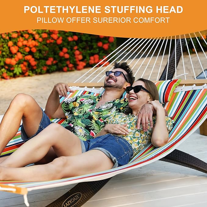 - LAZY DAZE HAMMOCKS: Lazy Daze Hammocks is large enough to accommodate 2 people. The hammock bed size is 78 inches x 55 inches. A 12-feet hammock with 2 steel chain links. Double Hammock with wood spreader bar, 55 inches durable hardwood spreader bar made of FSC-Certified wood, it’s designed to safely support a maximum capacity of 450 pounds