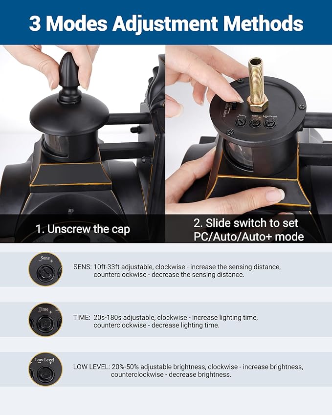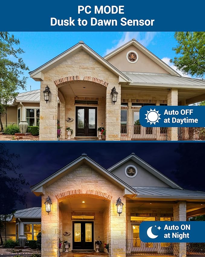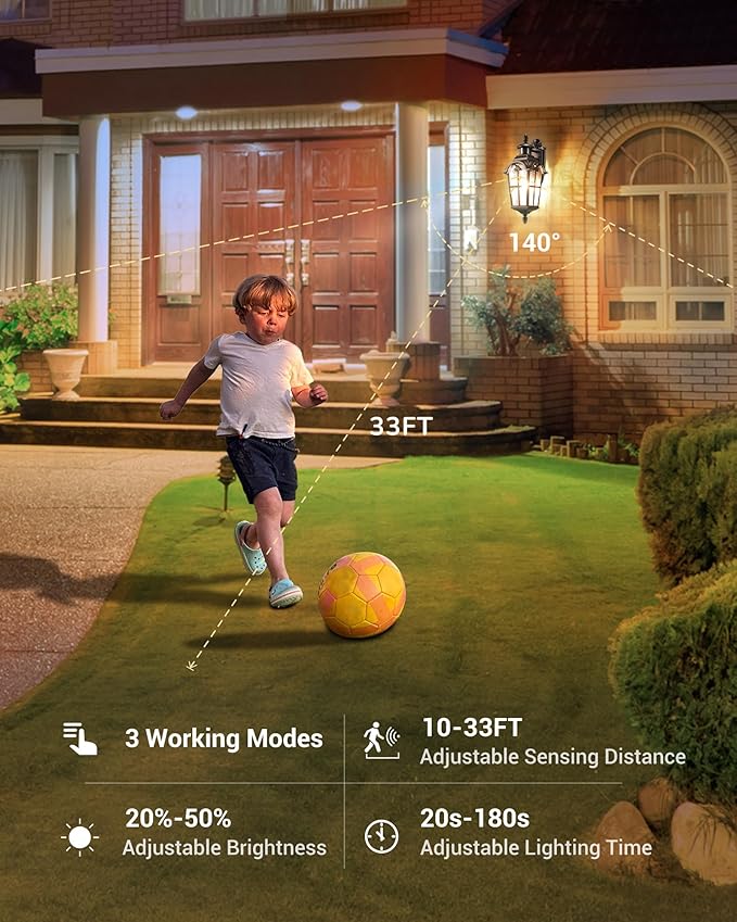 - 【Advanced Motion Sensor and Dusk to Dawn Sensor】Equipped with a smart PIR motion sensor and photocell sensor, 3 lighting modes(PC, Auto, Auto+) to choose from. Motion sensor has a 140-degree and 10–33 feet range detection. This motion sensor outdoor light will auto on at dusk with 20% dim light, activated with 100% high light once motion is detected, and revert to 20% brightness after 2 minutes without movement, and will auto off at dawn. Adding more convenience to your life