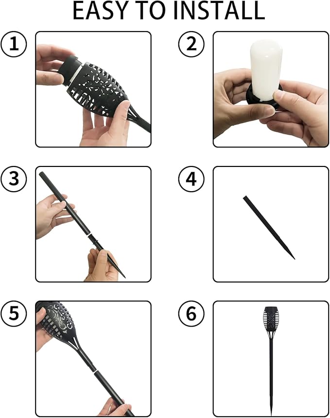 - đ„ăAuto Charge & Auto Light Upă: Solar tiki torches for outside automatically collect solar energy all day in direct sunlight and turn it into electricity to continuously charge the battery and include a photosensitive control switch on its solar panel, From dusk to dawn (no sunlight), the lights are automatically turned on, and when the sun rises (the solar panel receives sunlight) the lights will automatically turn off and charge automatically. Convenient and practical.