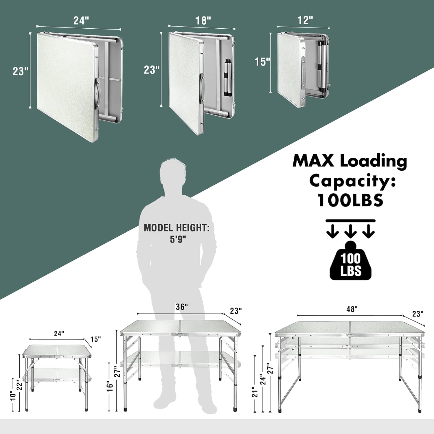 - Compact Folding Table with Adjustable Heights: 2 Adjustable heights for all occasions. Our 3ft folding table can be adjusted to a comfortable height of 16'' or 27''. The large surface area is 36''L x 23''W and can support up to 100 LBS, providing plenty of utilization space