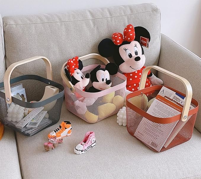 - The metal mesh storage organizer basket bin with wooden handle is a great way to organize or decorate your home, office, apartment, lofts, or other living spaces. This wire basket also can be a fruit basket or garden basket and storing those fruits and vegetables outside the refrigerator. Also as extra storage to meet your needs for household use.