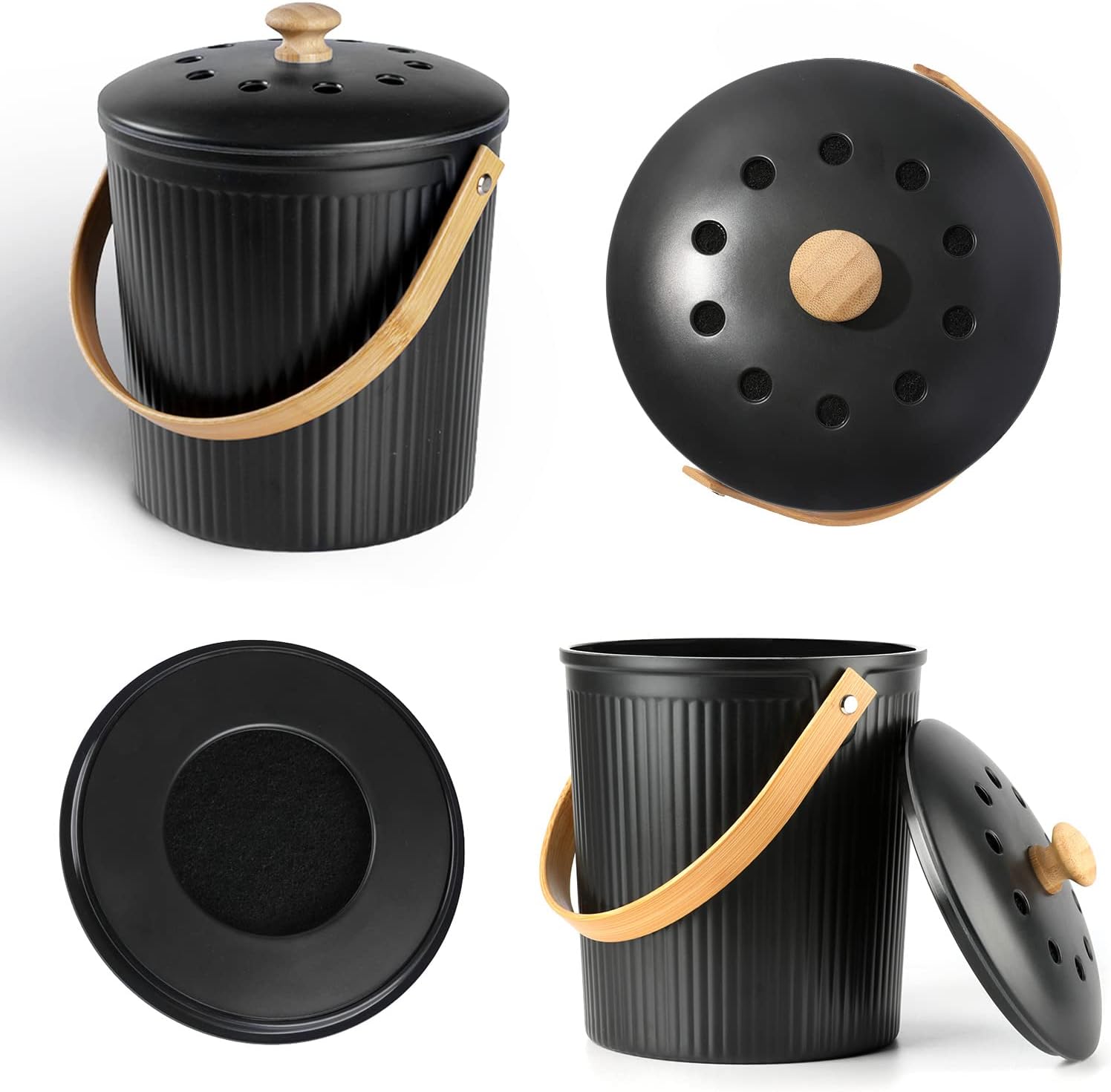 - Odorless: The counter compost bin has a vented lid and charcoal filter that absorbs and traps odors inside of the compost bucket. No worry about your kitchen smelly decomposing waste again.
