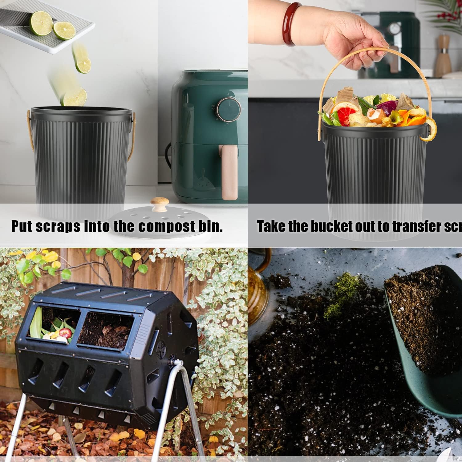 - Practical: Store your food scraps, vegetable peelings, tea leaves, flowers, coffee grounds and other compost materials with this compost bucket. Never waste your food scraps again and create your own eco-friendly rich compost for your garden.