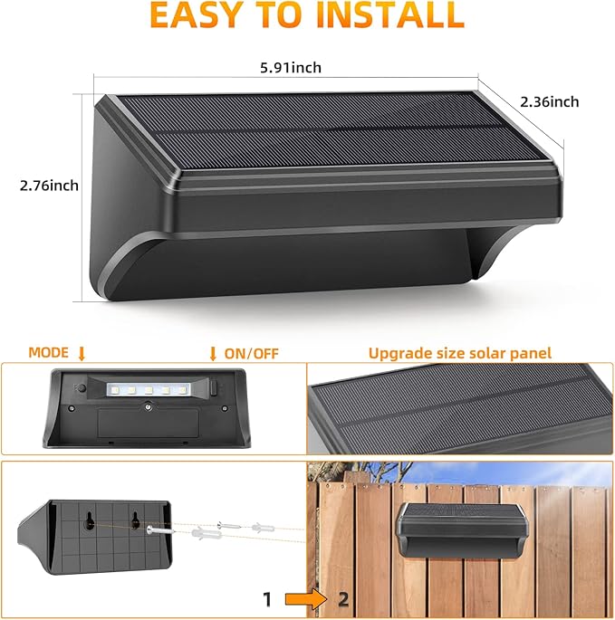 - 【PAY ATTENTION】Solar products need to be installed in places without obstructions. If they are installed indoors, under the eaves, in the shade of trees, or in the backlight, it will cause the illusion that the lights are broken. The solar panel needs direct sunlight to charge, if your solar fence lights show different brightness from other lights after using for a period of time, please check for the above problems. When there is a product quality problem, please contact us in time.
