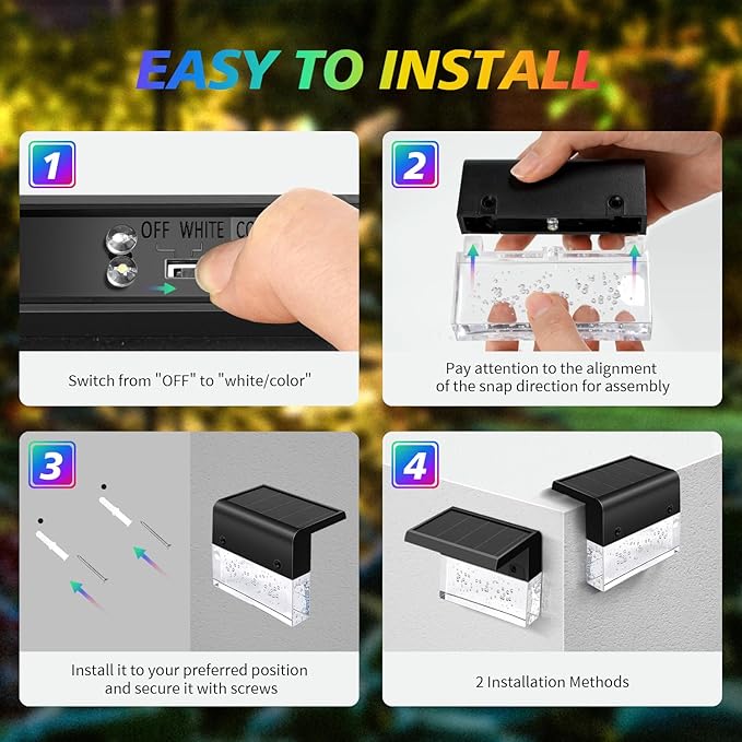 - 【EASY INSTALLATION】Solar step lights for outside is easy to install. Only two screws or double-sided tape (not included) are needed to fix the solar garden light on any flat surface, such as fence, step edges, stair railings, etc. Tip: Before using for the first time, please select the desired light mode "warm yellow/color" and charge the solar lights for fence by installing it in direct sunlight for 1 day.