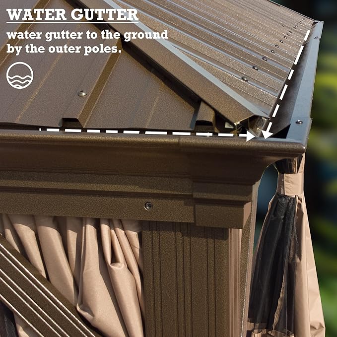 - ✅Metal Canopy/Roof and Gutter Design - The metal canopy of this gazebo ensures longevity and durability. Its roof, made of sheet metal, boasts a robust 29-gauge thickness, which is thicker than most gazebos on the market. its water gutter system ensures that rainwater is efficiently directed away from the edges of the frame and poles