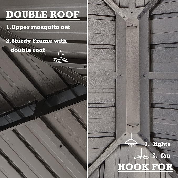- ✅Two hooks have been specially crafted to accommodate fans or lights, enhancing the ambiance of your gazebo and making it a comfortable and inviting space.