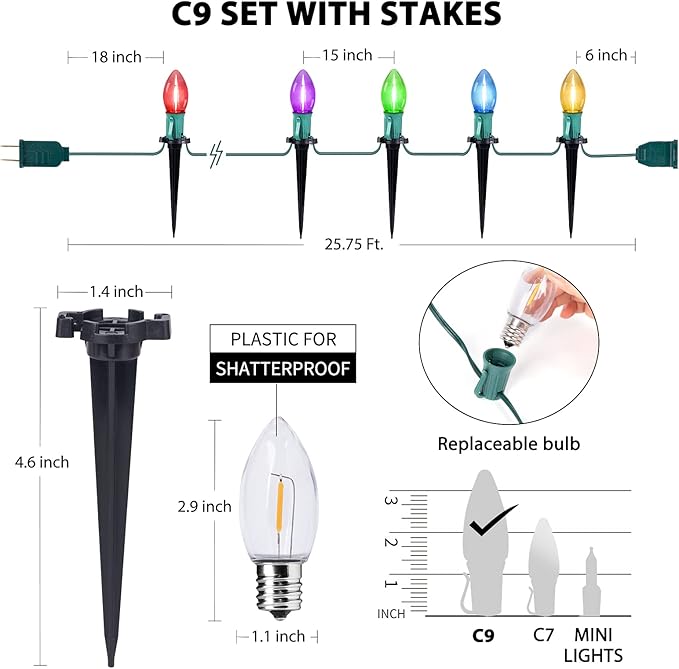 - Vintage LED String Lights with Stakes: UL listed 25.7 Feet 20 LED lights strands with 15 inches spacing, 20 Stakes, 3.9 inches anchor spike, E17 holder compatible, plug in and enjoy it. It is also an exquisite gift for friends, families, or relatives too