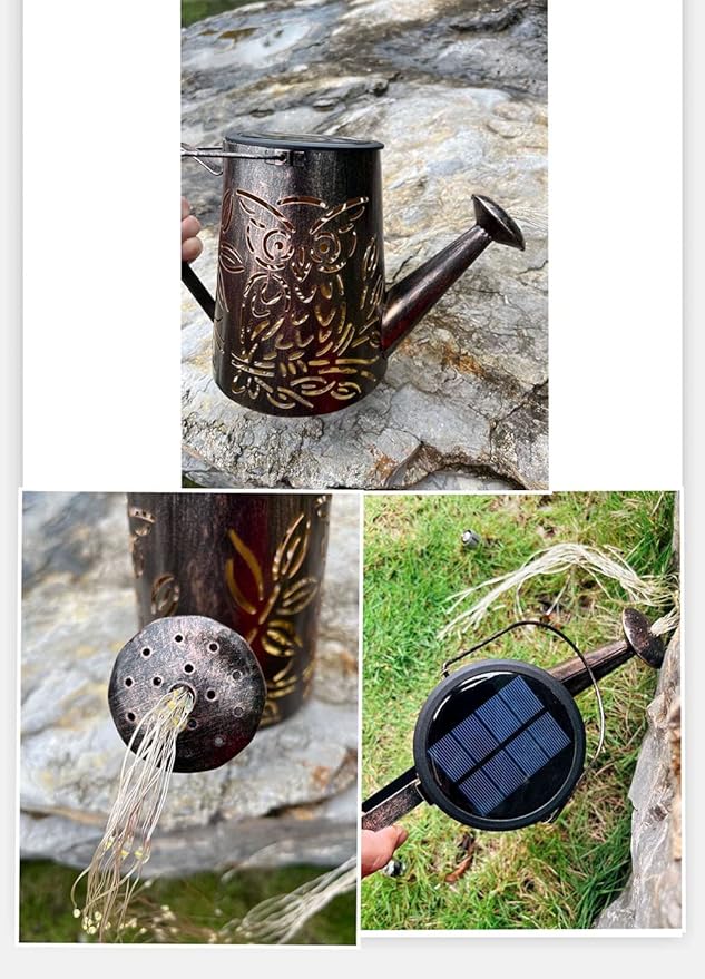 - Creative solar waterfall lights: The Solar Lantern Lights has a unique owl pattern.When the lanterns is lit, a cute owl decor Silhouette,flower pattern on the ground and create a relaxed and comfortable atmosphere. Choose a special place in your yard , the watering can with lights will appear to be pouring water, it is cute flower bed decor.