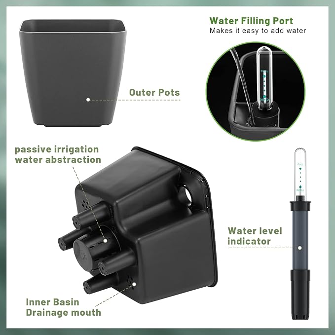 - GS Garden self-watering planters is an ideal plant pot for for All Outdoor/Indoor plants. The special water inlet design can avoid soil collapse and lead to excessive hardening of the flower soil. The root system can fully grow in the soft soil.Ideal for residential and commercial grades