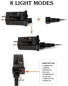 - Convenient Timer Function & 8 Modes & Memory Function: The button is at the end of the plug to turn on/off the timer function, press the button for few seconds till the green light on/off to turn on/off the timer function and switch 8 modes (combination, in waves, sequential, slo glo, chasing/flash, slow fade, twinkle/flash, steady on). This fairy lights could remember the setting of previous night you set.