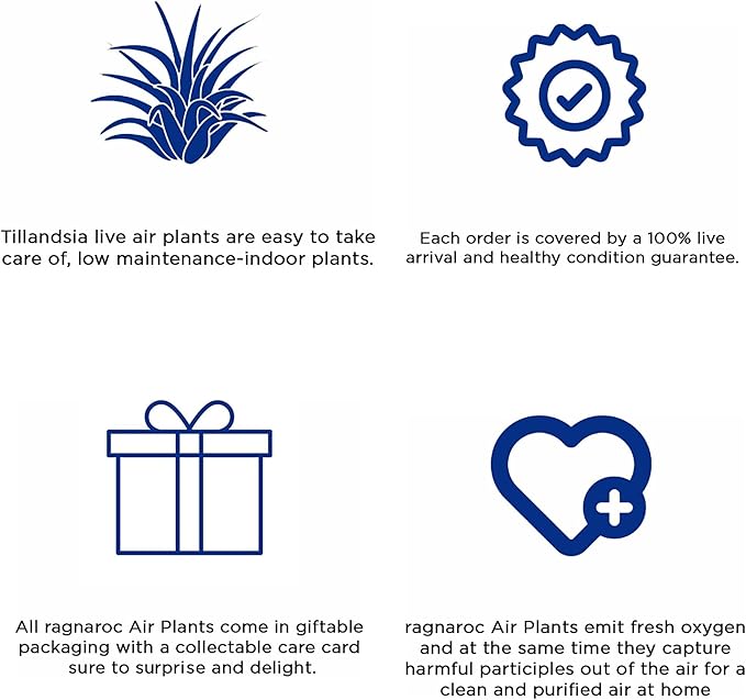 - HEALTHY PLANT ARRIVAL ASSURANCE: ragnaroc is committed to delivering vibrant and thriving air plants to your doorstep. Our live air plants are packed directly from Florida, and every order comes with a promise of their safe and healthy arrival. If, for any reason, you find yourself less than satisfied with our plants, please inform us, and we will promptly arrange a full refund or send you replacement plants.