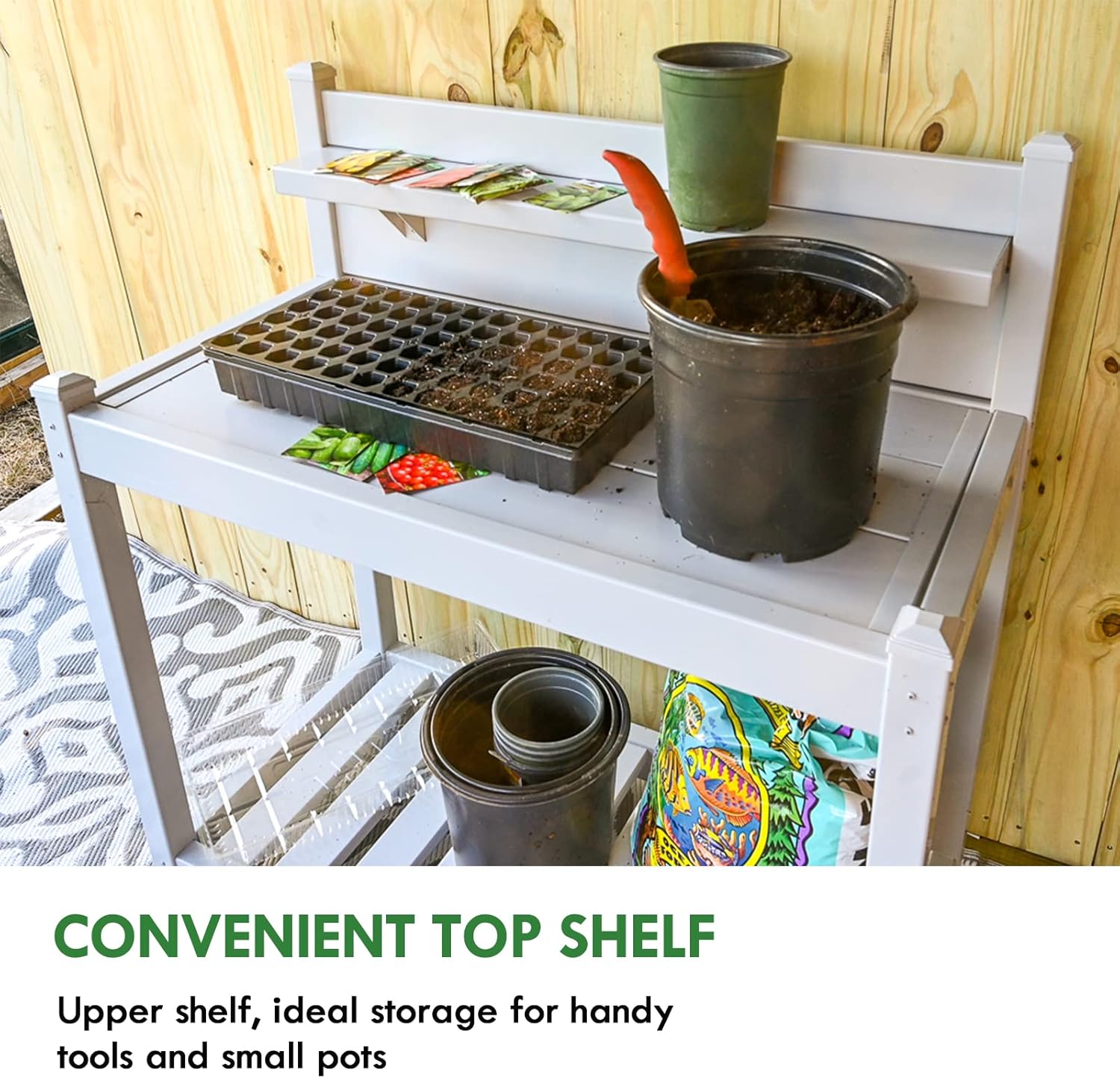 - SPACIOUS WORKING AREA: The workstation table provides ample room for you to work. The spacious table top is perfect for planting seeds and repotting plants. The upper shelf can be used to store your seeds, small plants, fertilizers, and gardening supplies. Weight capacity of the table top is 110 lbs.