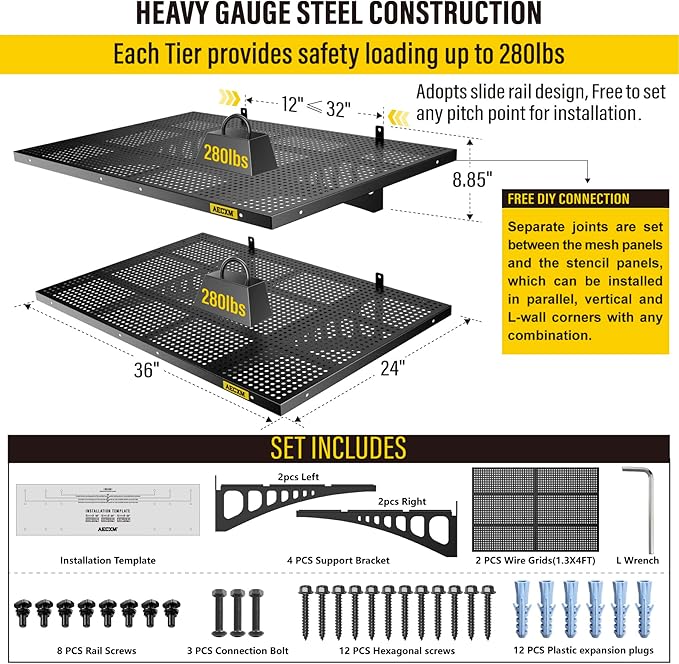 - Premium Craftsmanship: This garage wall shelving is crafted from a single steel sheet, precision-stamped and folded for strength. Unique high-density hole design enhances functionality while delivering a sleek, modern aesthetic
