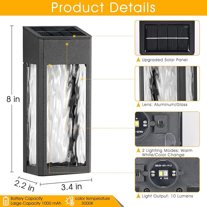 - 【Metal Fence Lights Solar Powered】The solar fence lights are made of high-quality aluminum, metal and glass material, and the solar fence lights using lamination technology, corrosion resistant, heat resistant. No need to worry about rust of outdoor lights solar powered. The glass lampshade adopts a unique design of water textured glass, which improves the light transmittance of the lamp and emits brighter light. Perfectly suitable for outdoor night lighting and festival decoration.