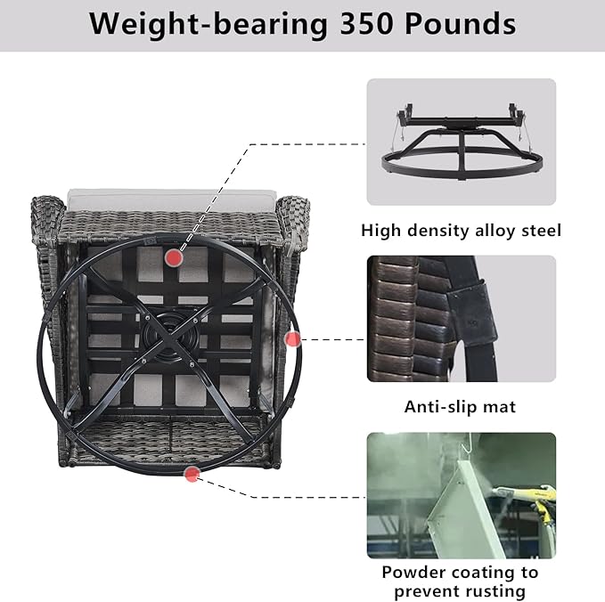 - Patio Furniture Set Introduction: The 6-piece patio furniture set includes 2 swivel glider chairs, 2 ottomans, 1 loveseat and 1 glass top coffee table, ottoman can not only be used to relax your legs, but also can be used as a small table or small stool. The swivel chairs can hold up to 350 pounds.