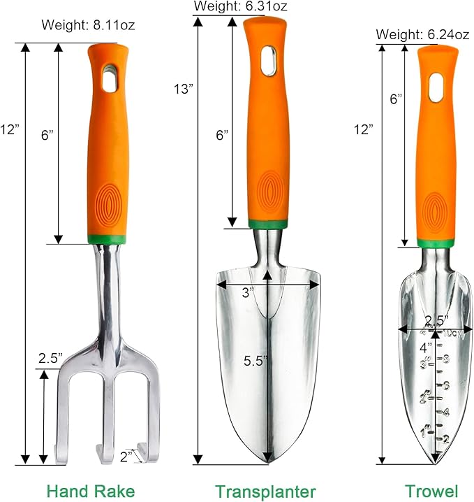 - ●3-Piece Precision Garden Tool Set: 3 Pieces of top-notch gardening equipment make up the ultimate garden tool set, including digging with a trowel, raking loose soil, transplanting with a spade.