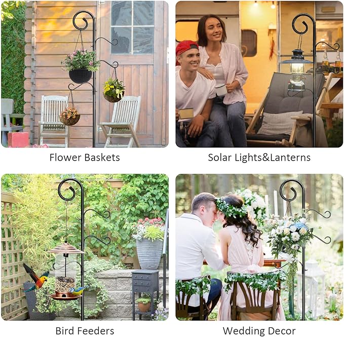 - 【Versatile shepherd's Hooks Pack of 2】Our multifunctional shepherd's hooks are perfect for hanging bird feeders, birdhouses, solar lights, lanterns, flower baskets, plant pots, wind chimes, and other things you like. It is a great choice for decorating your porch, backyard, and garden. It is also widely used in outdoor weddings.