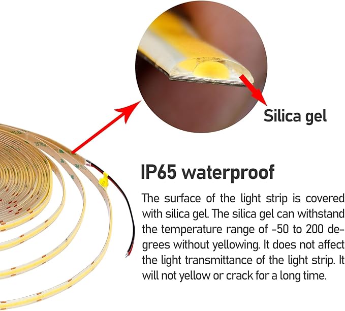 - 【COB LED STRIP】384LEDs/M(3.3ft), 3840LEDs/32.8ft(10M), COB light strips have more dense LED chips, Which make the emitting units nprecedentedly close to each other, and create super even lighting performance. At the same time, it brings higher luminous efficiency.