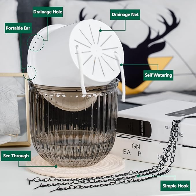 - Hanging Self-Watering System: Includes chains and wicks to transfer water from the outer pot to the inner pot for consistent moisture.