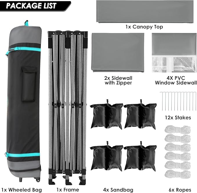 - 【Package Includeds】1x 10x20 Folding Frame, 1x Top cover, 6 x Sidewalls ( 2 Sidewall with Zipper and 4 Sidewall with Window ), 6x Sandbags, 12x Stakes, 6x Ropes, 1x Roller bag, 1x Manual. If you have any questions, please contact us